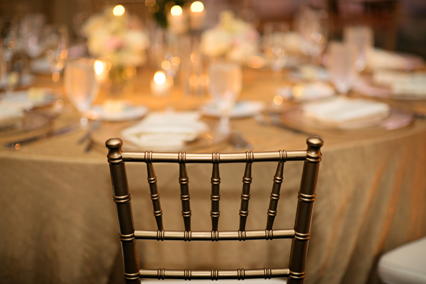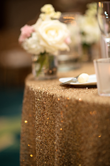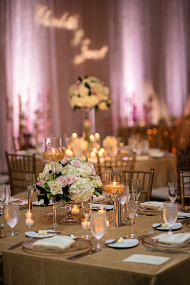 Photography by Kristen Weaver. The Hilton Orlando served as the perfect setting for Liz and Jamol’s sophisticated Soiree. Sticking with a color palette of gold’s, ivories, and Light pinks, with a pop of peacock blue, the ballrooms were transformed into a very formal setting. Occasions by Shangrila provided pipe and drape backdrop and a canopy for our couple to marry under. Accented with floral arrangements of white hydrangea, cream roses, and cream football mums provided by Country Club Floral, the ceremony site evoked drama as guests entered. The reception room included pipe and drape designed to take guests breath away as they entered. Each table was covered in a gold linen and centerpieces included gold and white hydrangea and pink roses. Details to drool over included a gold beaded charger, gold table numbers, and gold lettered menu cards, and gold chiavari chairs that completed the look.